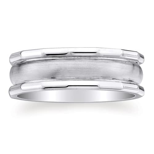 7mm wide 14K solid white Gold comfort-fit design wedding ring with satin finished center and raised angled polished sides.