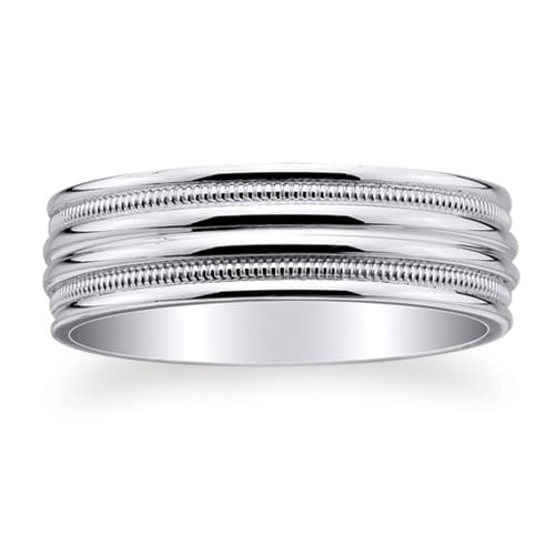7mm wide 14K solid white Gold comfort-fit design wedding ring with fluted center and inset milgrain details.