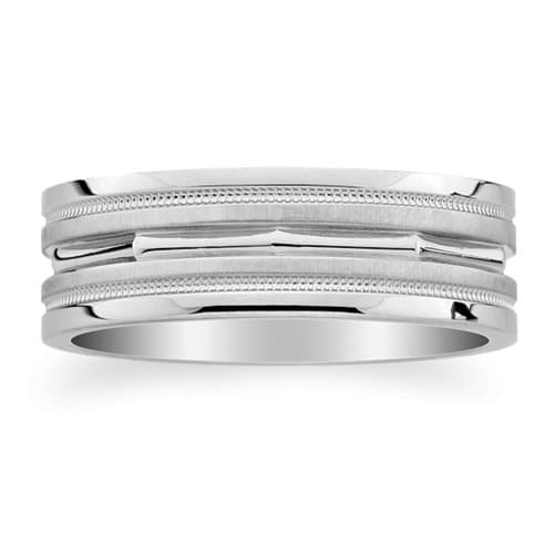 7mm wide 14K solid white Gold comfort-fit design wedding ring with angled center channel, inset milgrain details, and polished sides.