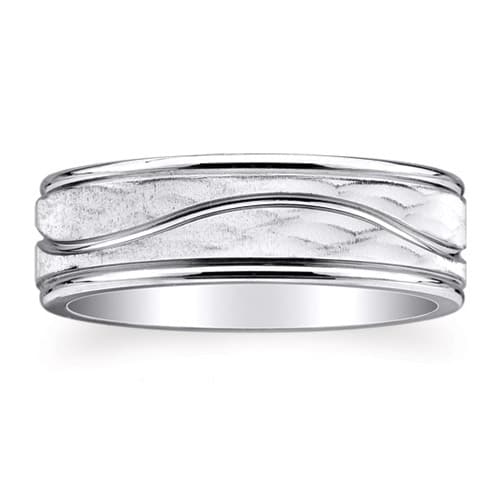 7mm wide 14K solid white Gold comfort-fit design wedding ring with brushed finished faux textured center surface, grooved wave going full circle, and polished sides.