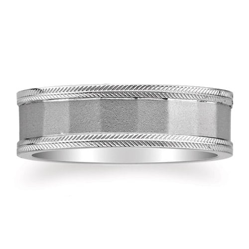 7mm wide 14K solid white Gold comfort-fit design wedding ring with satin finished angled center surface and double milgrain edges.