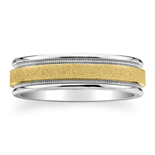6mm wide 14K solid white and yellow Gold comfort-fit design wedding ring with stone finished center surface and inset milgrain details.