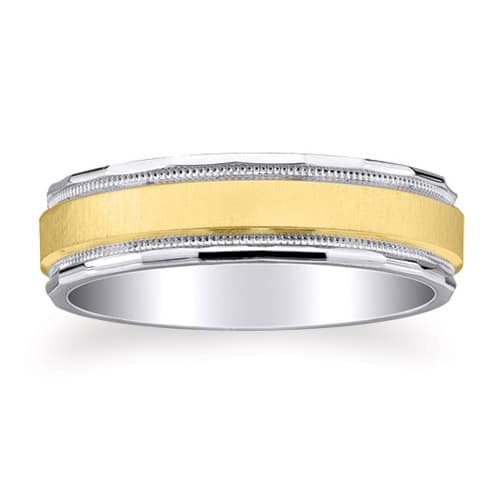 6mm wide 14K solid white and yellow Gold comfort-fit design wedding ring with satin finished center, inset milgrain details, and polished angled sides.