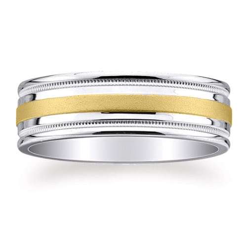 7mm wide 14K solid white and yellow Gold comfort-fit design wedding ring with a satin finished center line, inset milgrain, and polished sides.