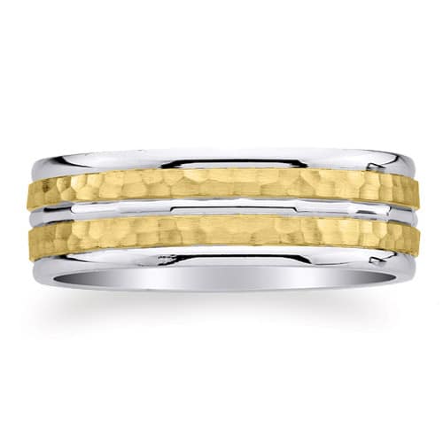 7mm wide 14K solid white and yellow Gold comfort-fit hammered design wedding ring with polished sides.