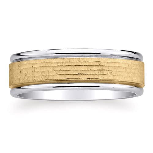 7mm wide 14K solid white and yellow Gold comfort-fit design wedding ring with faux textured center and polished sides.