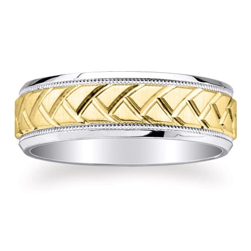 7mm wide 14K solid white and yellow Gold comfort-fit design wedding ring with tire-tread center design, inset milgrain details, and polished sides.