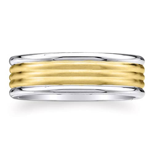 7mm wide 14K solid white and yellow Gold comfort-fit fluted design wedding ring with brushed center and polished sides.