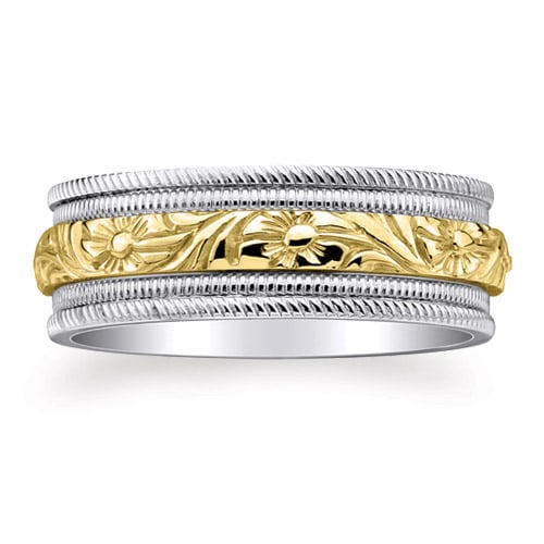 8mm wide 14K solid white and yellow Gold comfort-fit design wedding ring with intricate carved floral patterns on the center and double milgrain details on the sides.