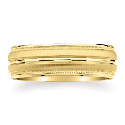 7mm wide 14K solid yellow Gold comfort-fit design wedding ring with inset milgrain and angled polished center channel.